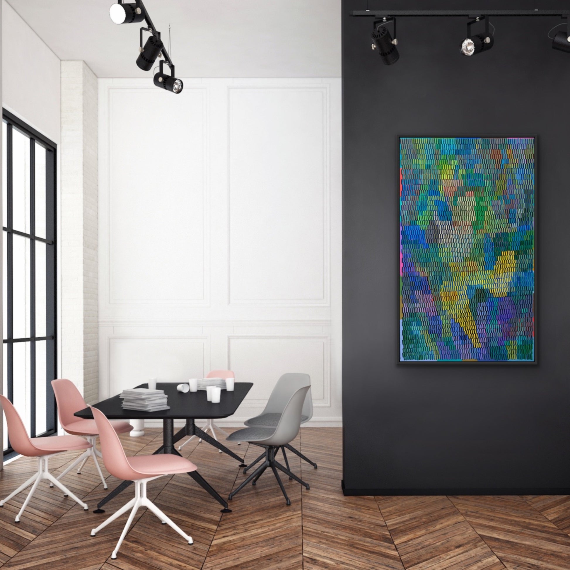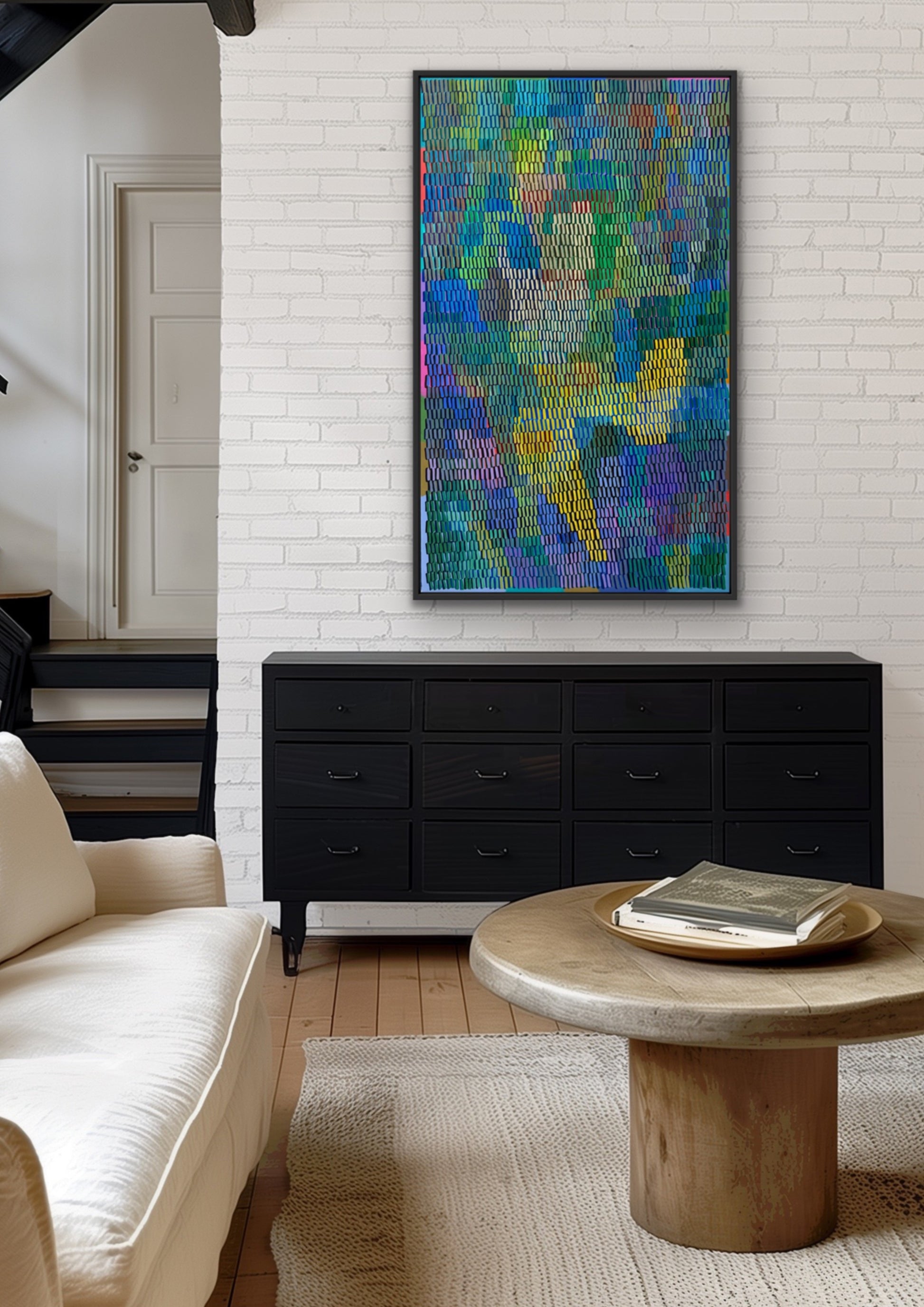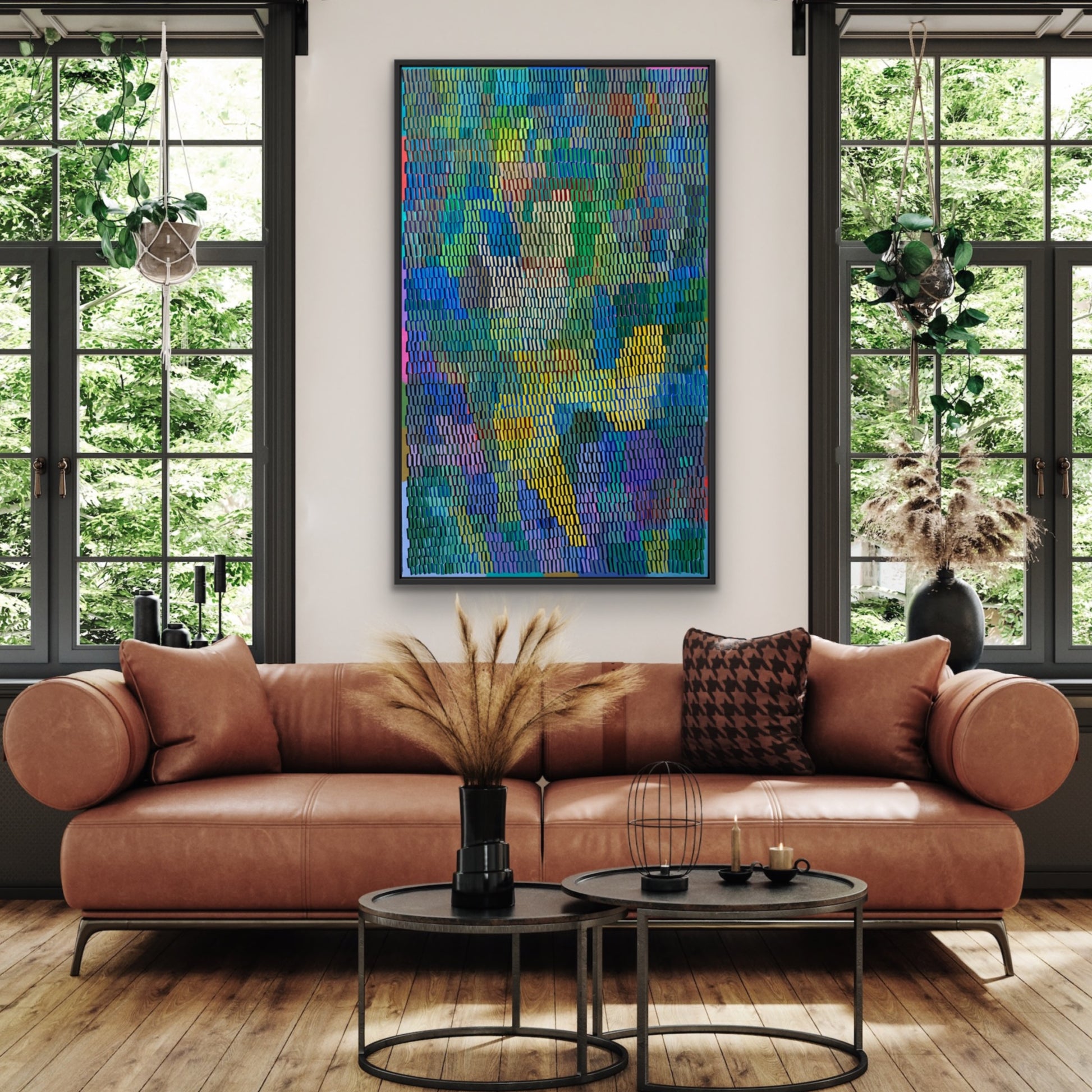 This abstract painting is a vibrant tapestry of spontaneity, each layer and gestural stroke telling a story of intuition and emotion. Crafted from memories and impressions, it captures the essence of life in its raw form. The repetition of mark-making serves a both meditation and a conduit for artistic fulfilment, infusing the art with a profound sense of depth and meaning.