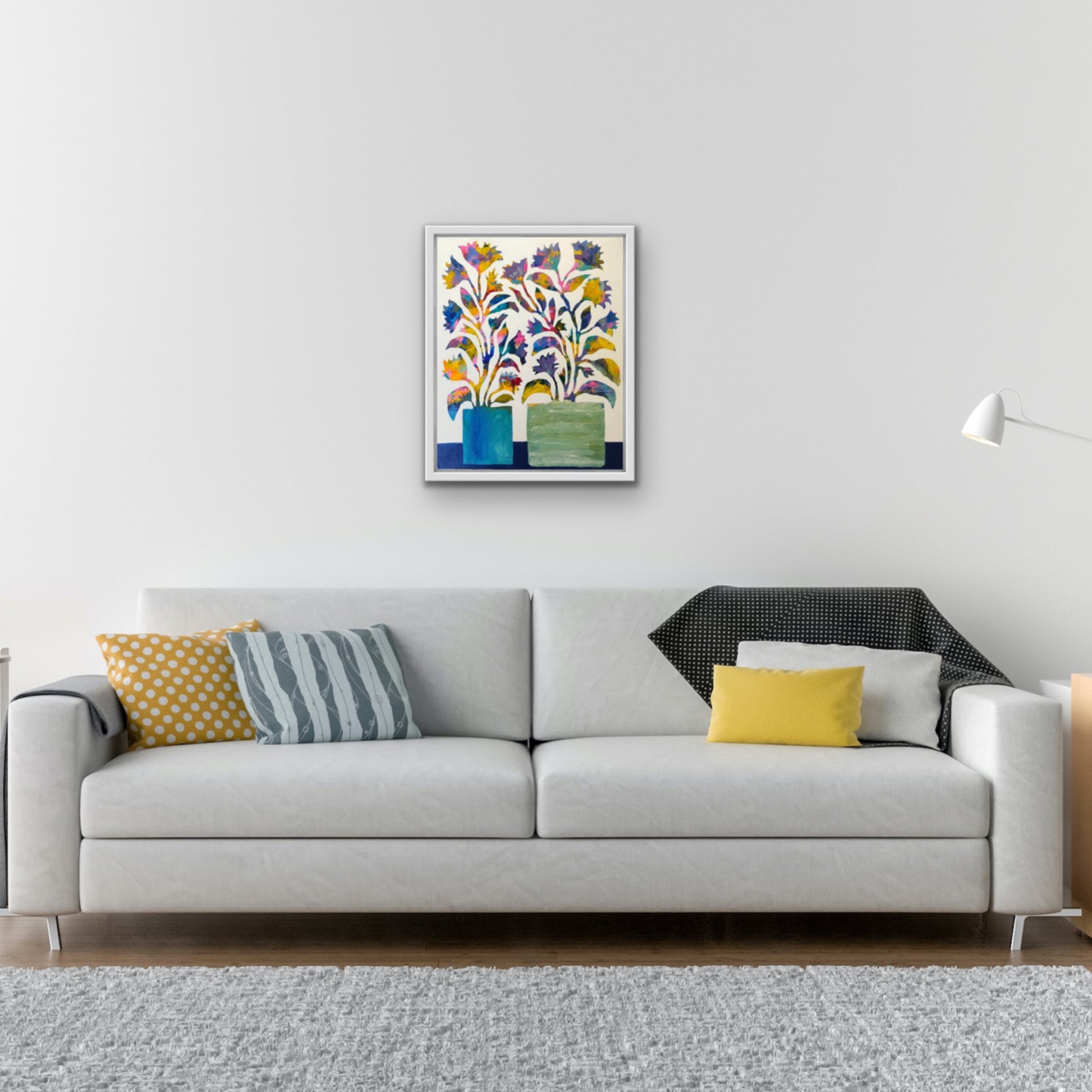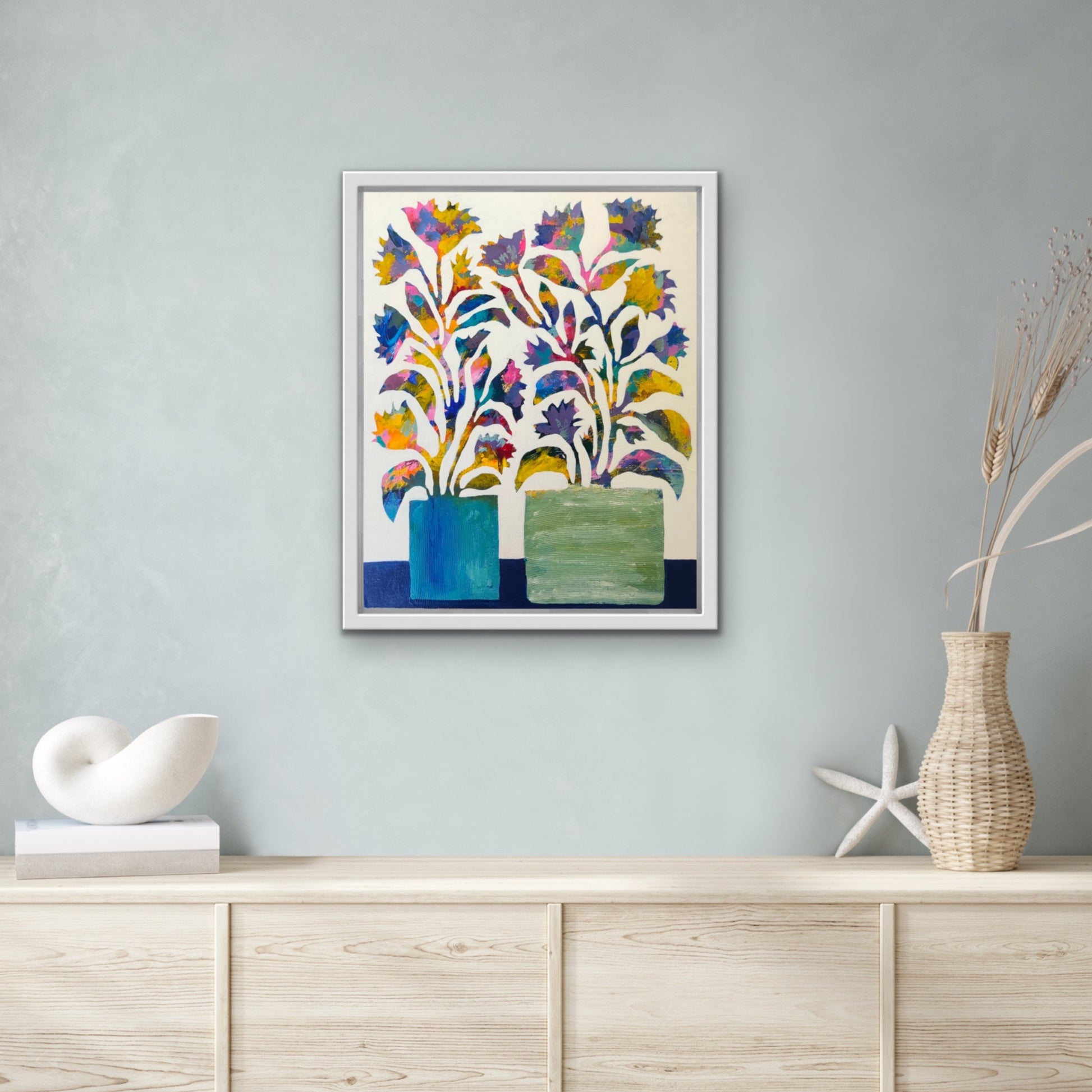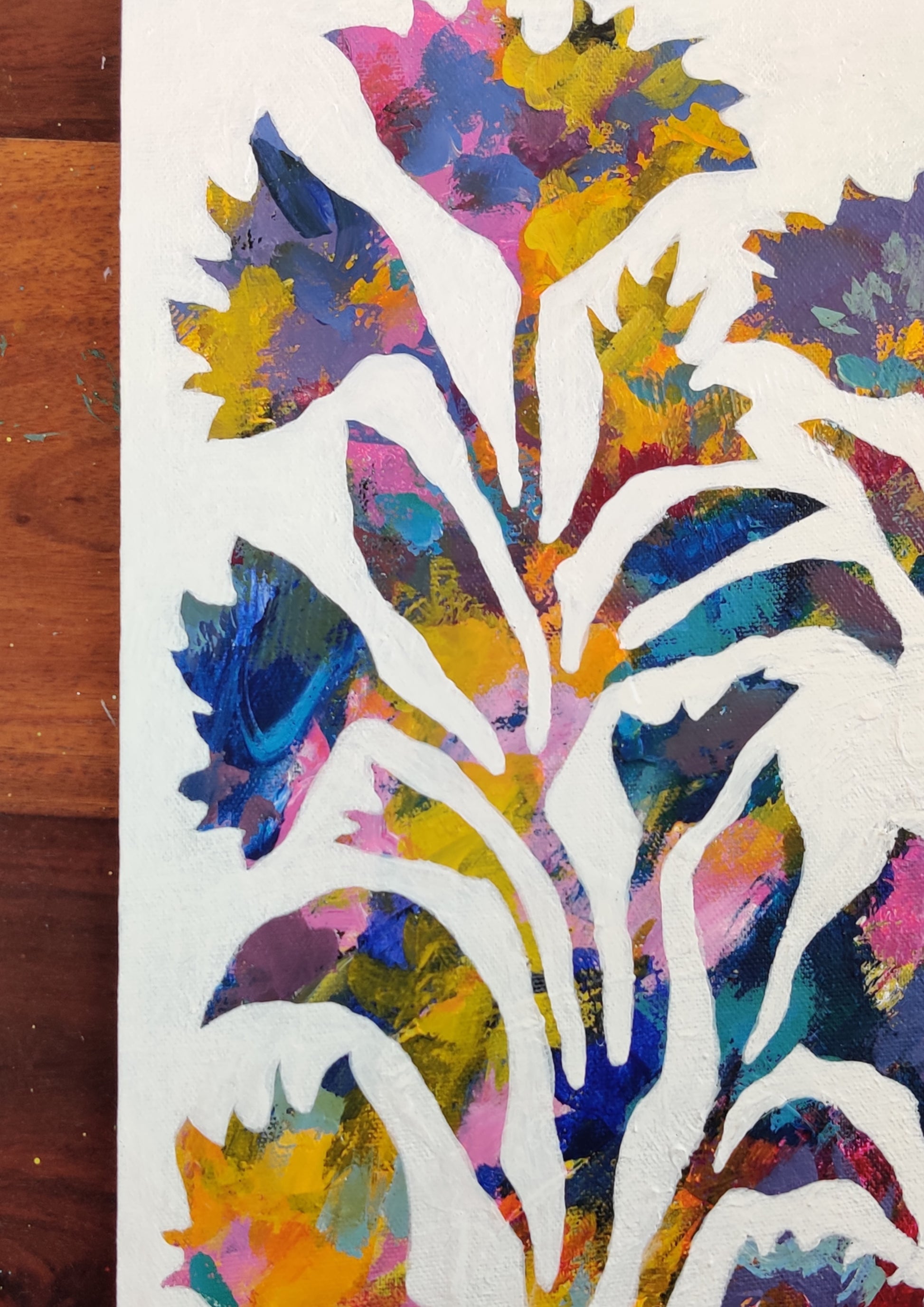 The semi abstract floral artwork is created in my intuitive style to juxtapose organic shapes and patterns over multiple layers of paint creating a textured abstract background.