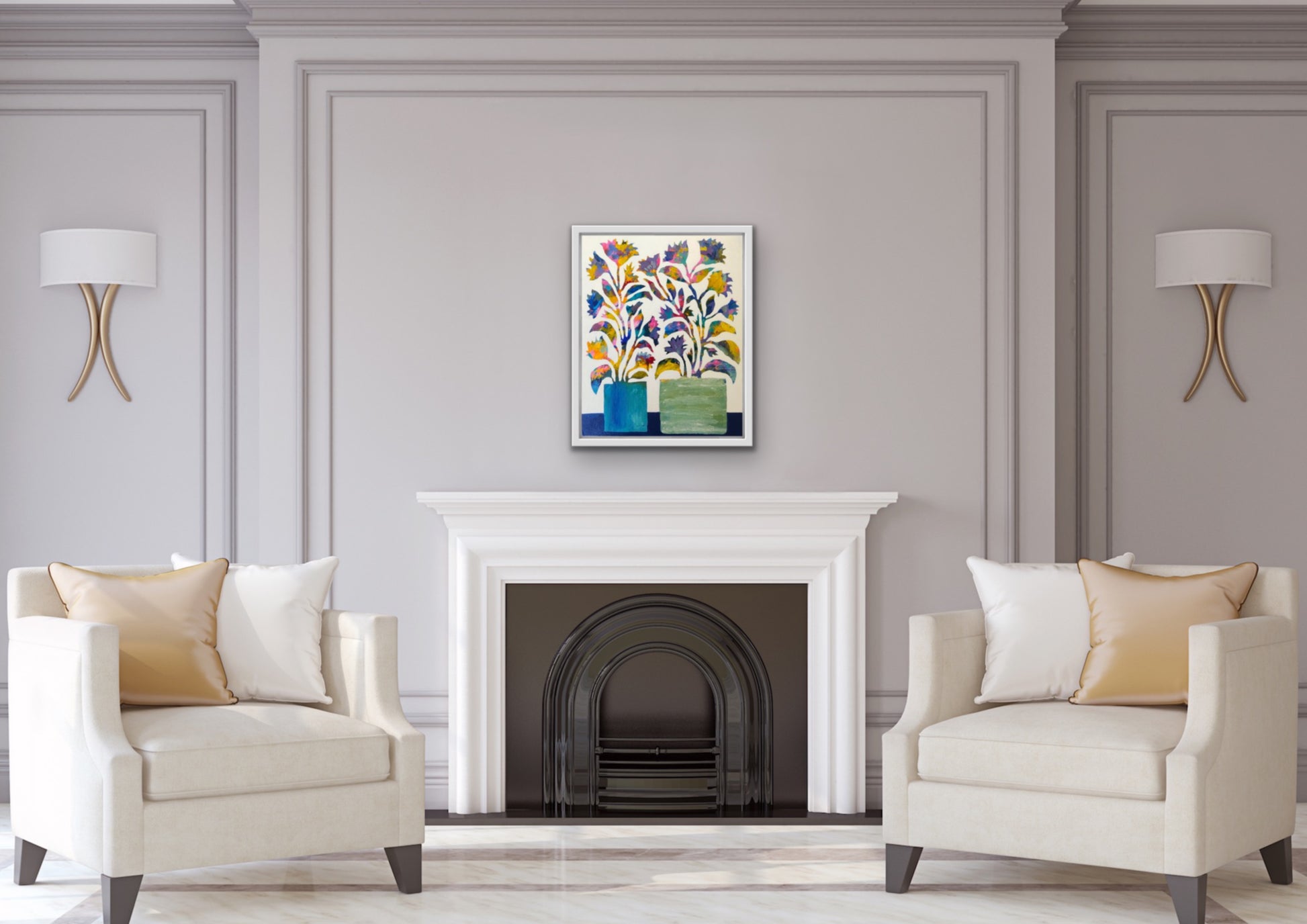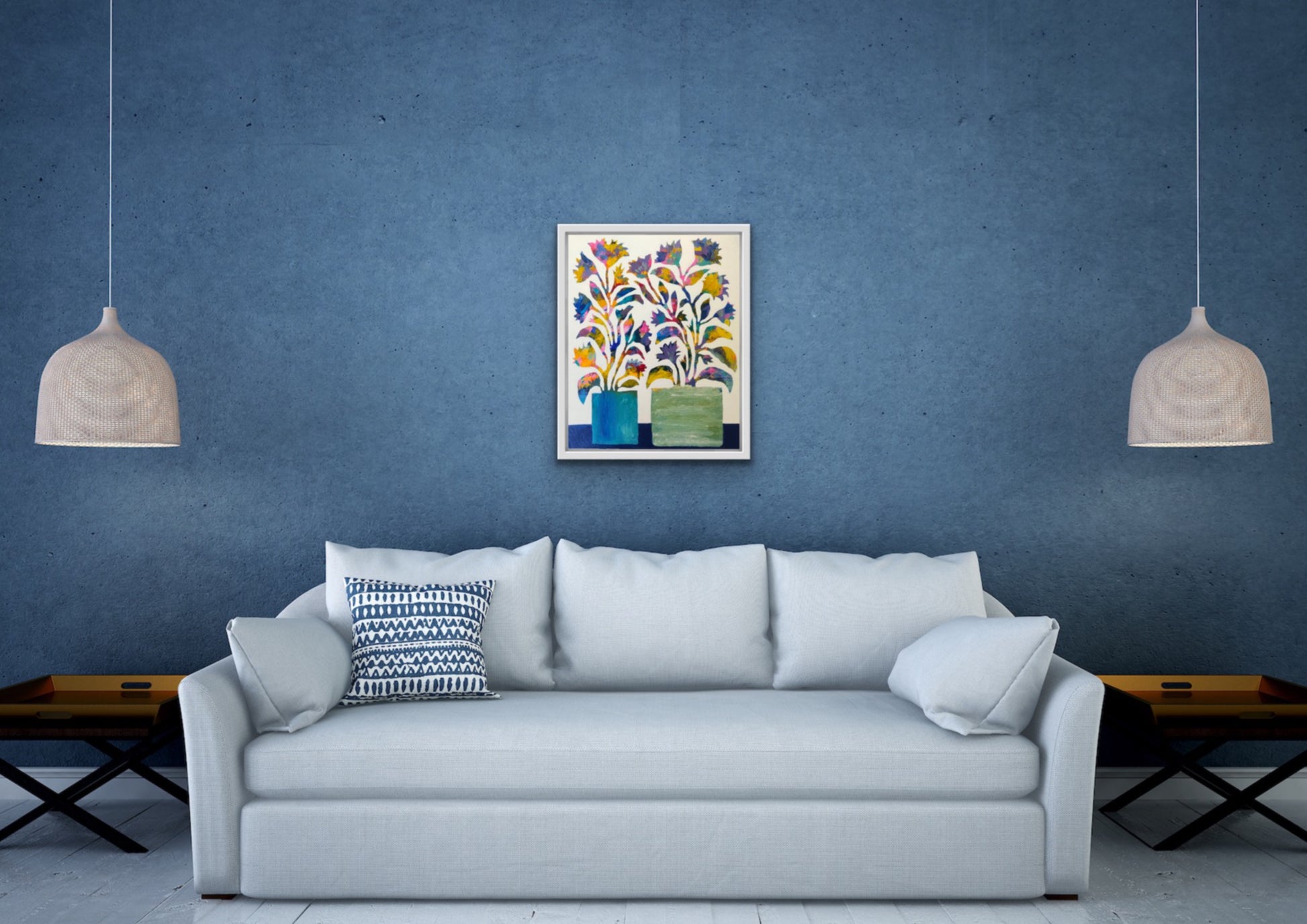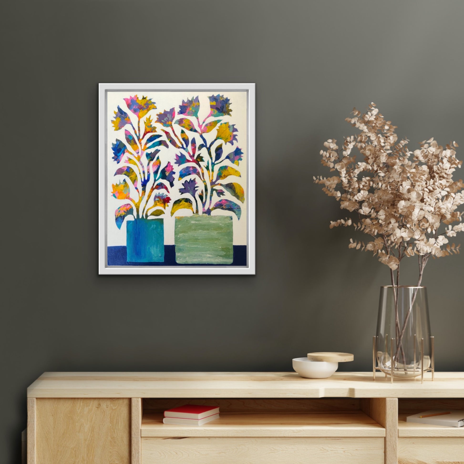 The semi abstract floral artwork is created in my intuitive style to juxtapose organic shapes and patterns over multiple layers of paint creating a textured abstract background.