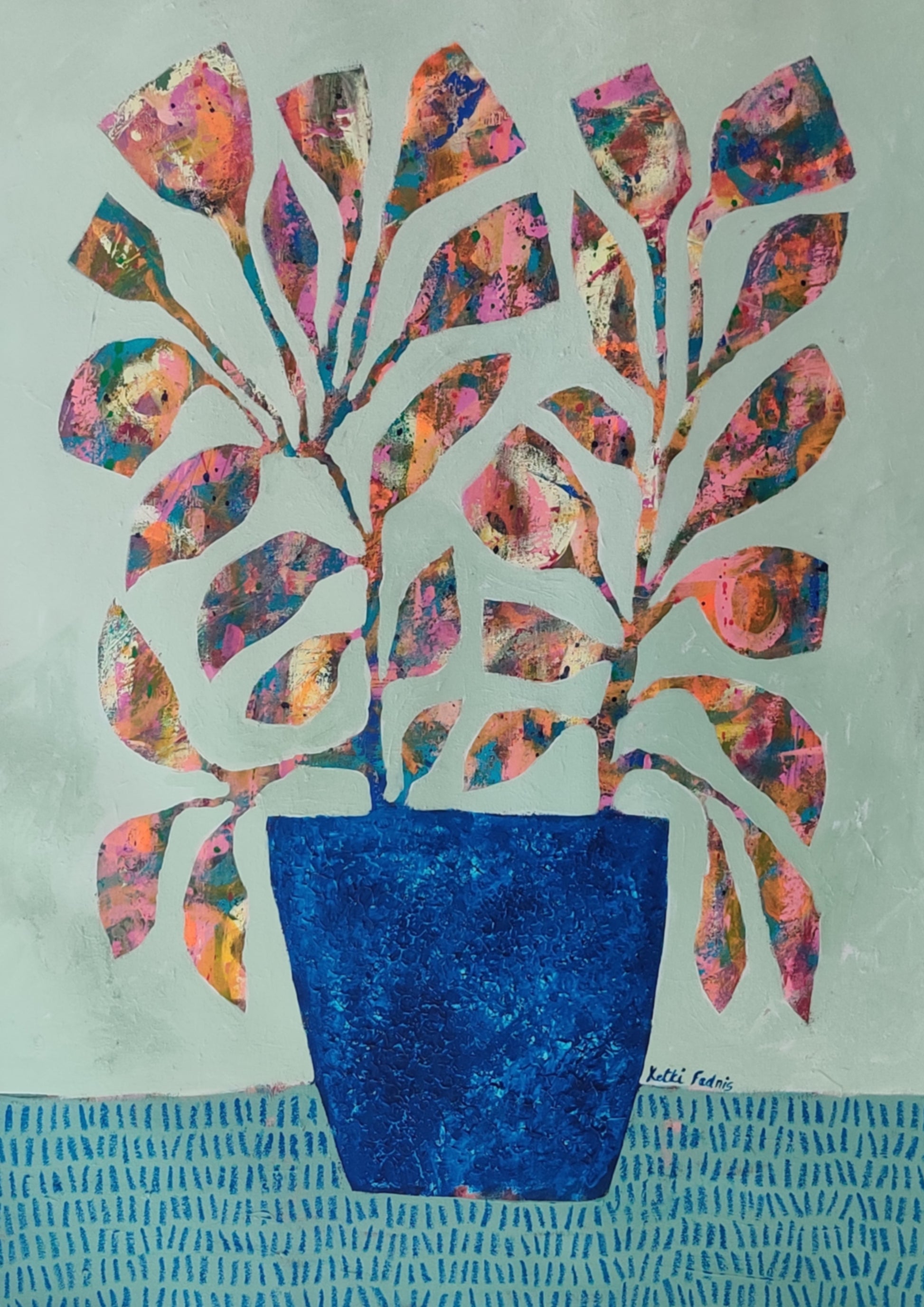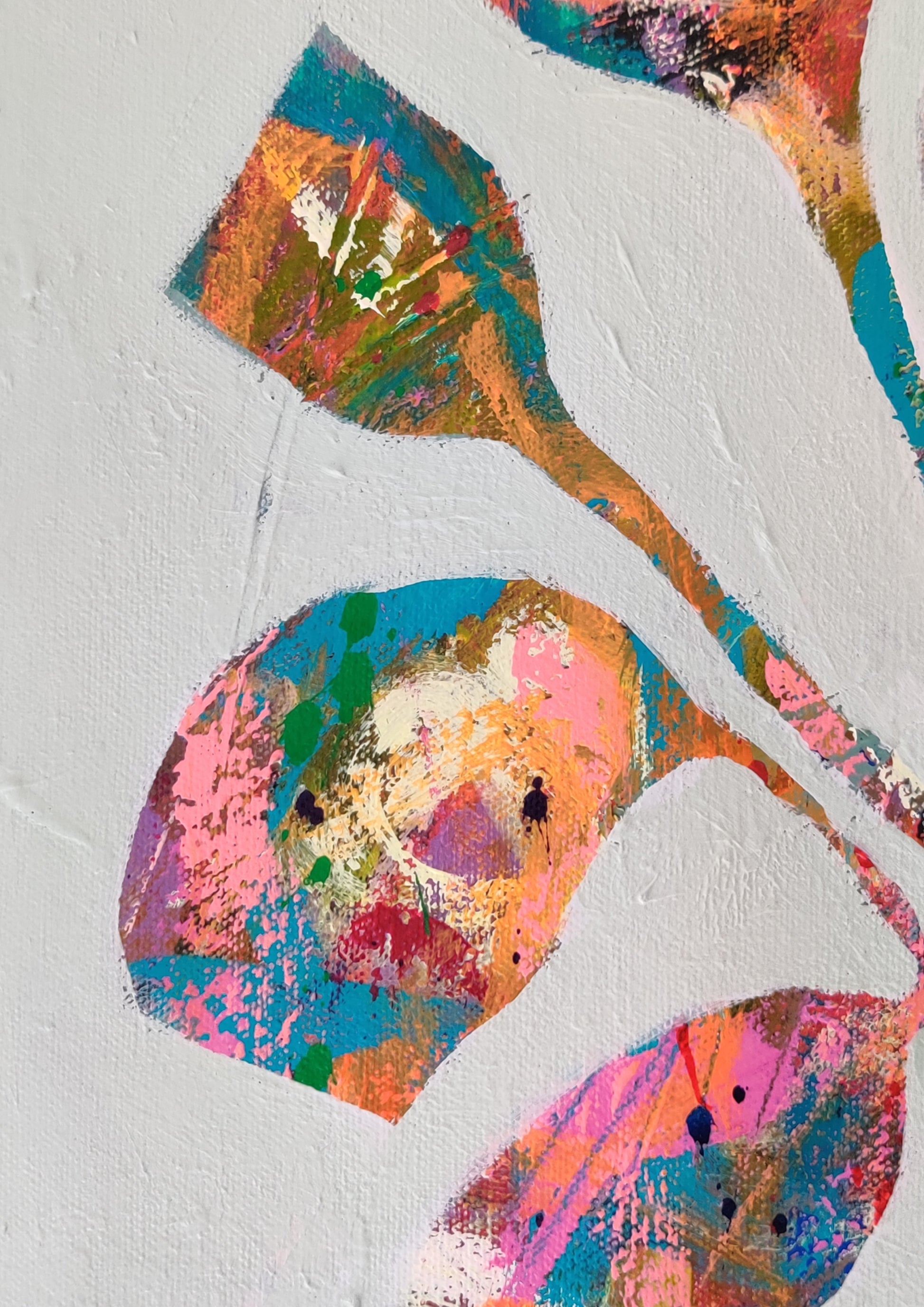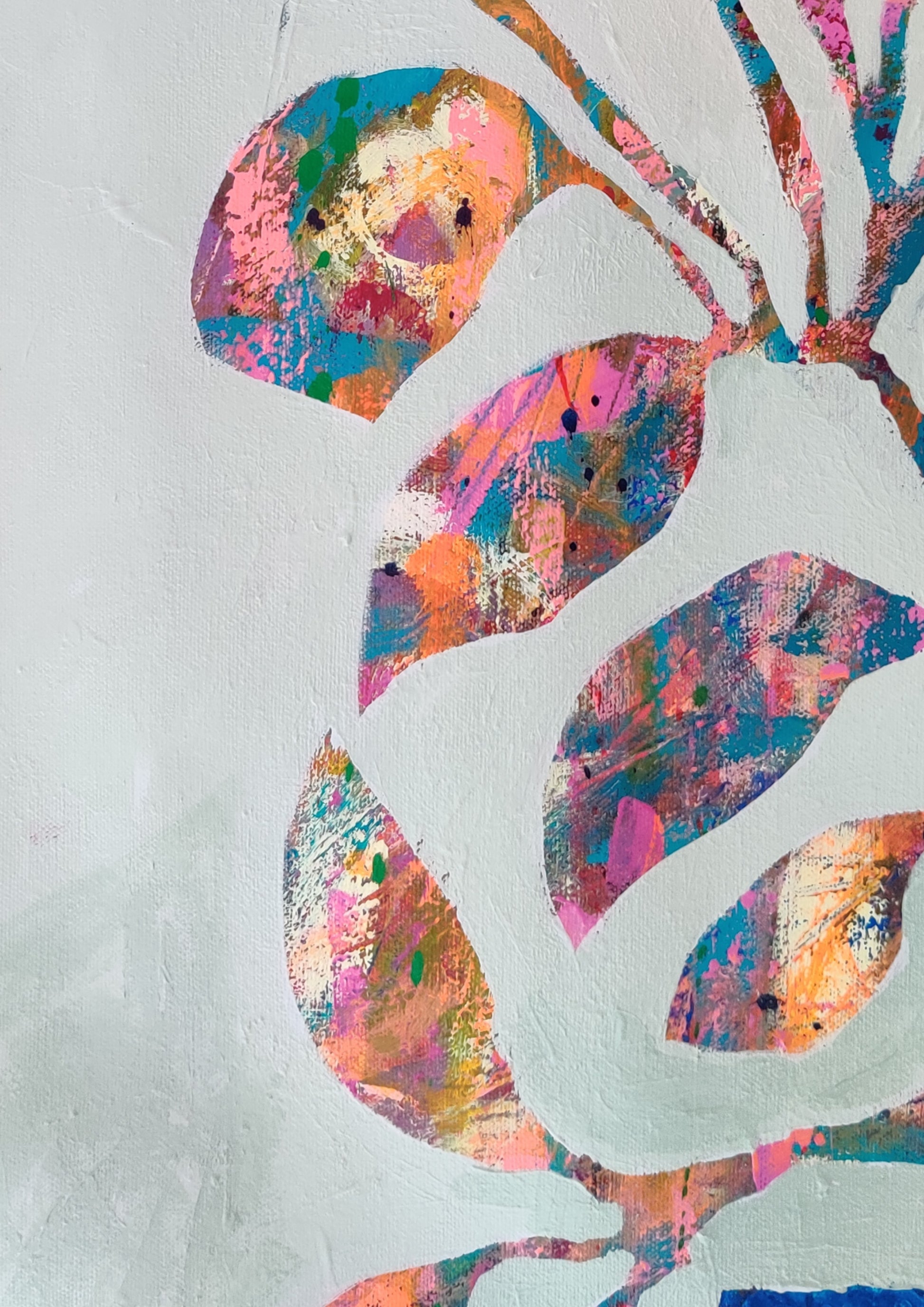 This semi abstract artwork is created in my intuitive style to juxtapose organic shapes and patterns over multiple layers of paint creating a textured abstract background.