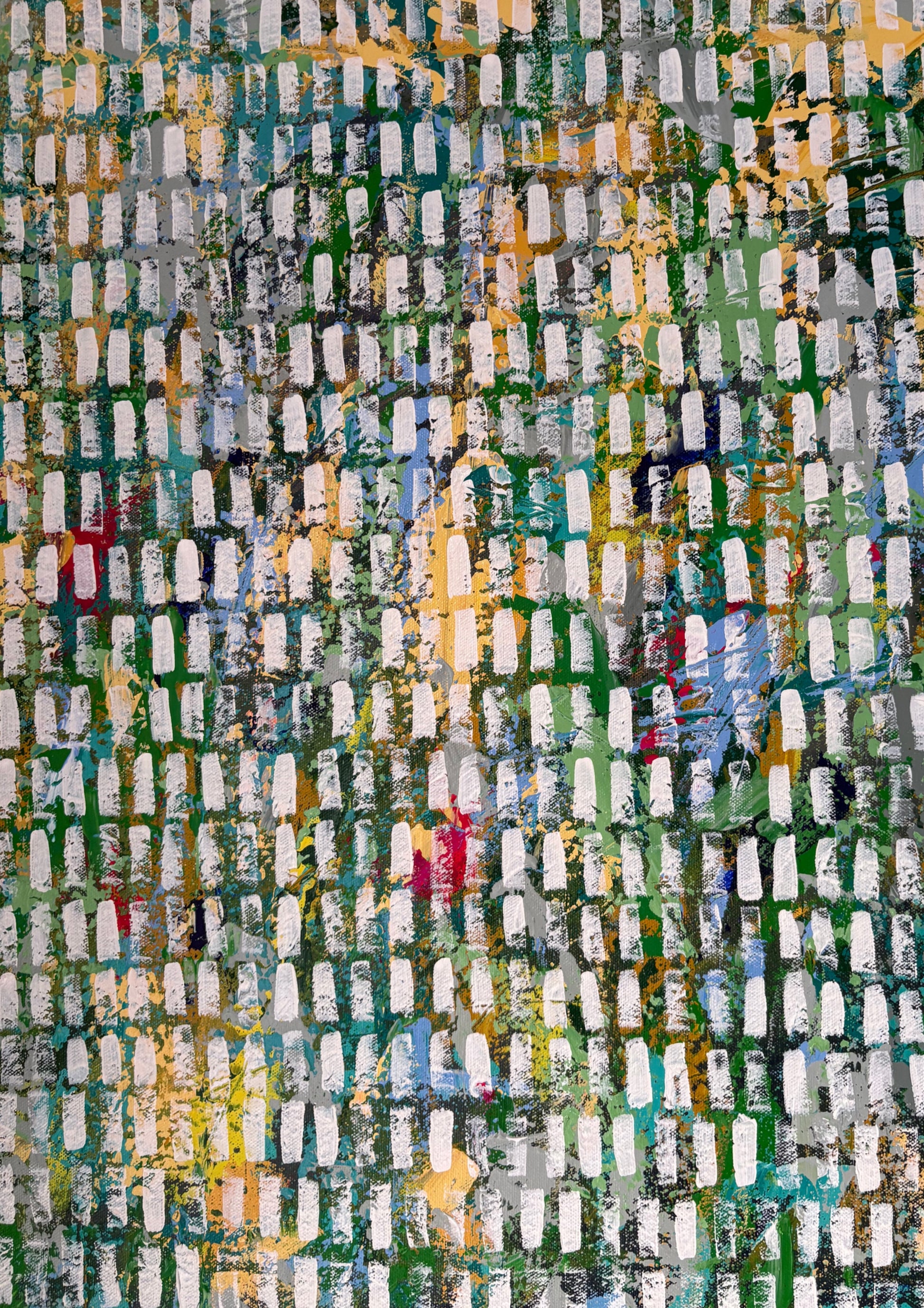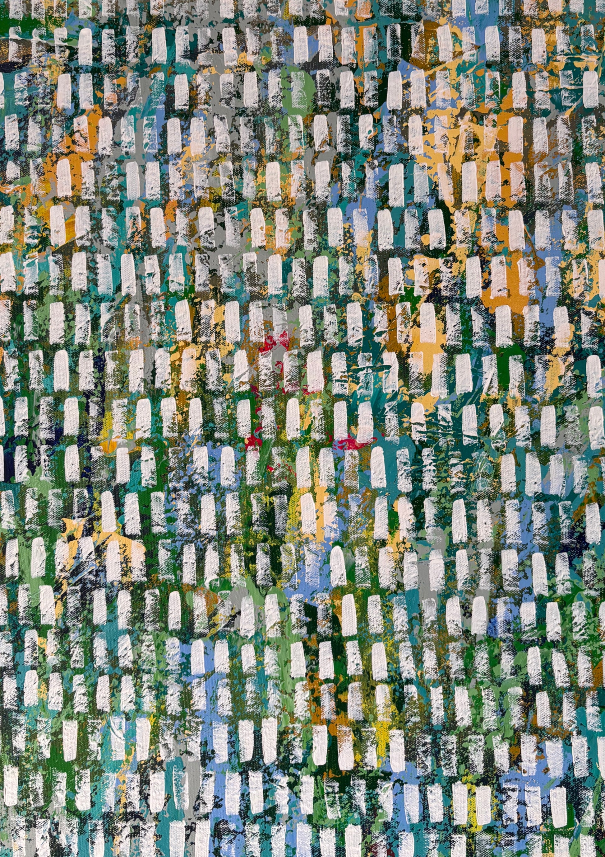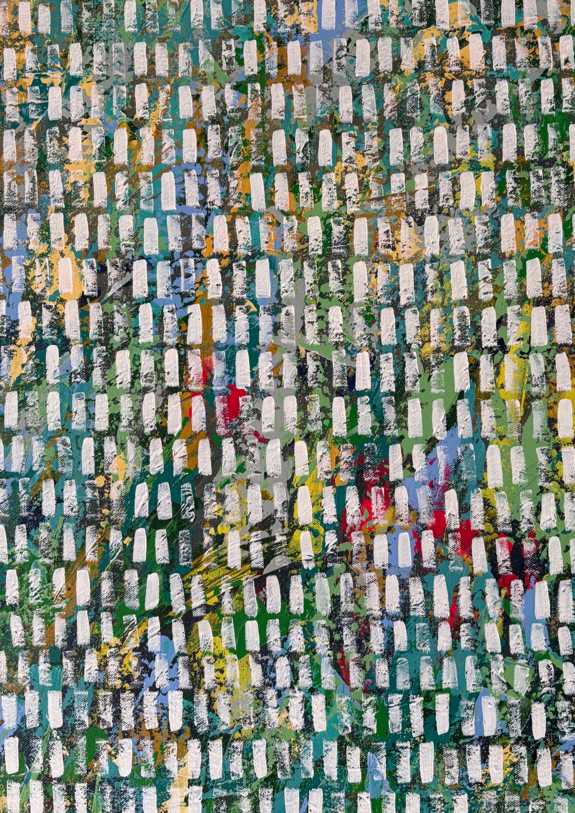 Intuitively created over multiple layers of acrylic paint which is spontaneous and gestural. The process of repetitive mark making in my art practice is meditative for me.