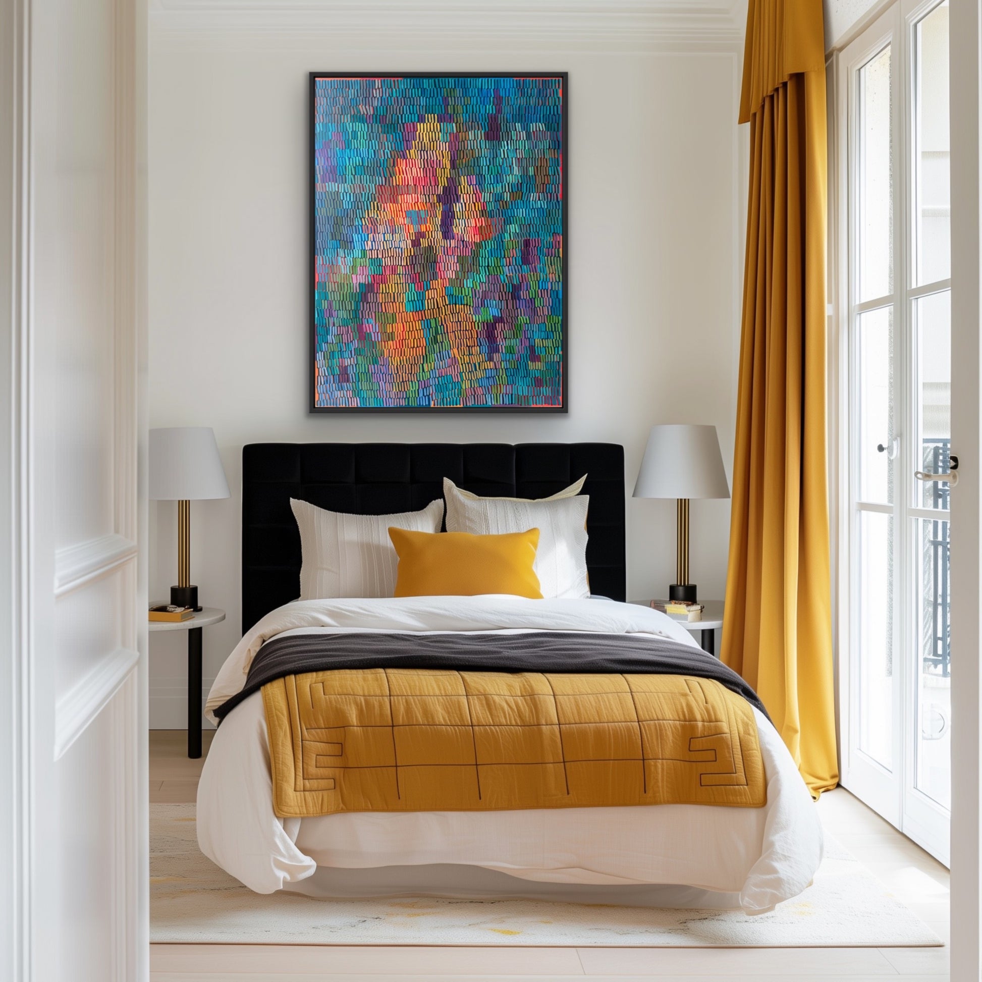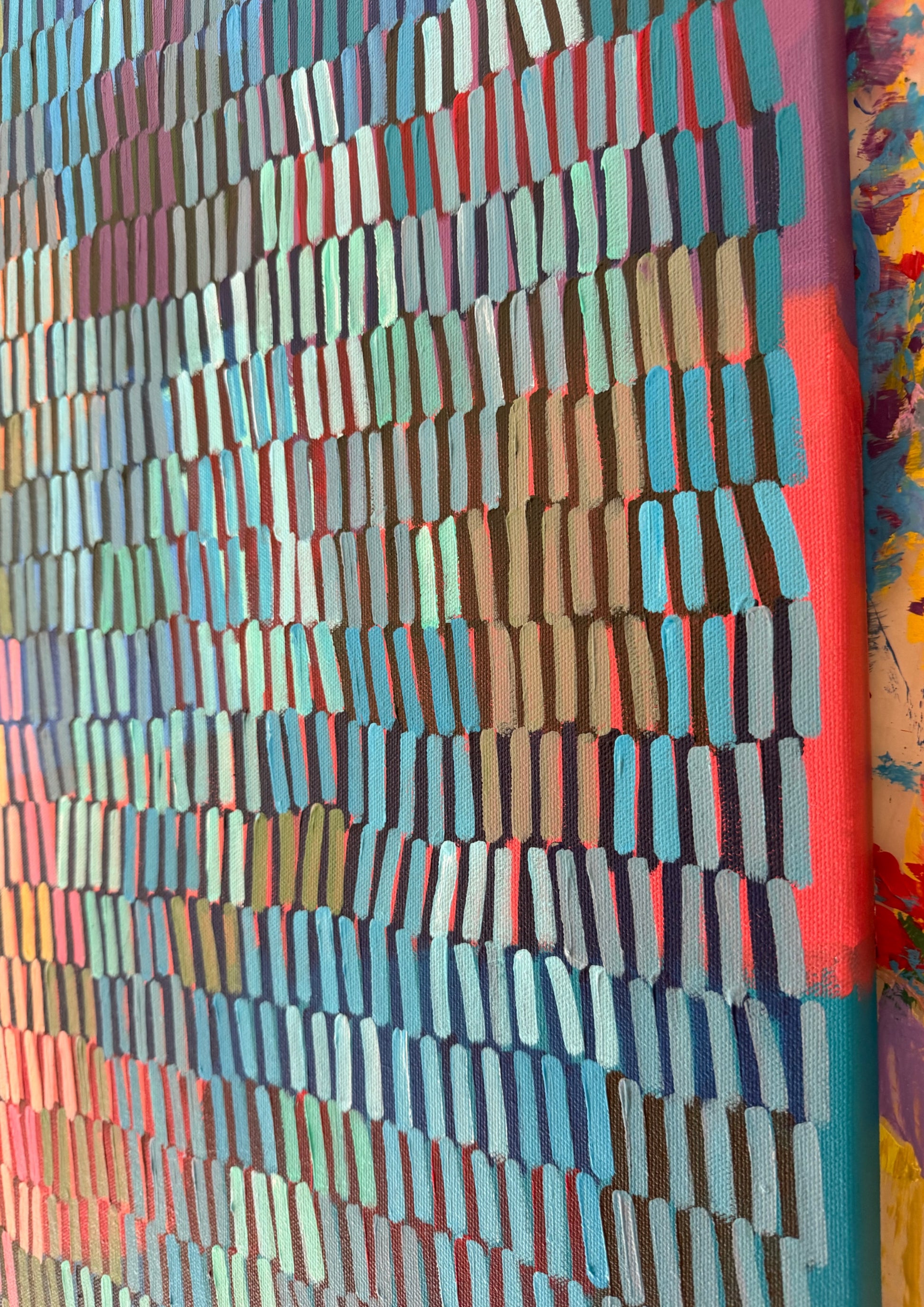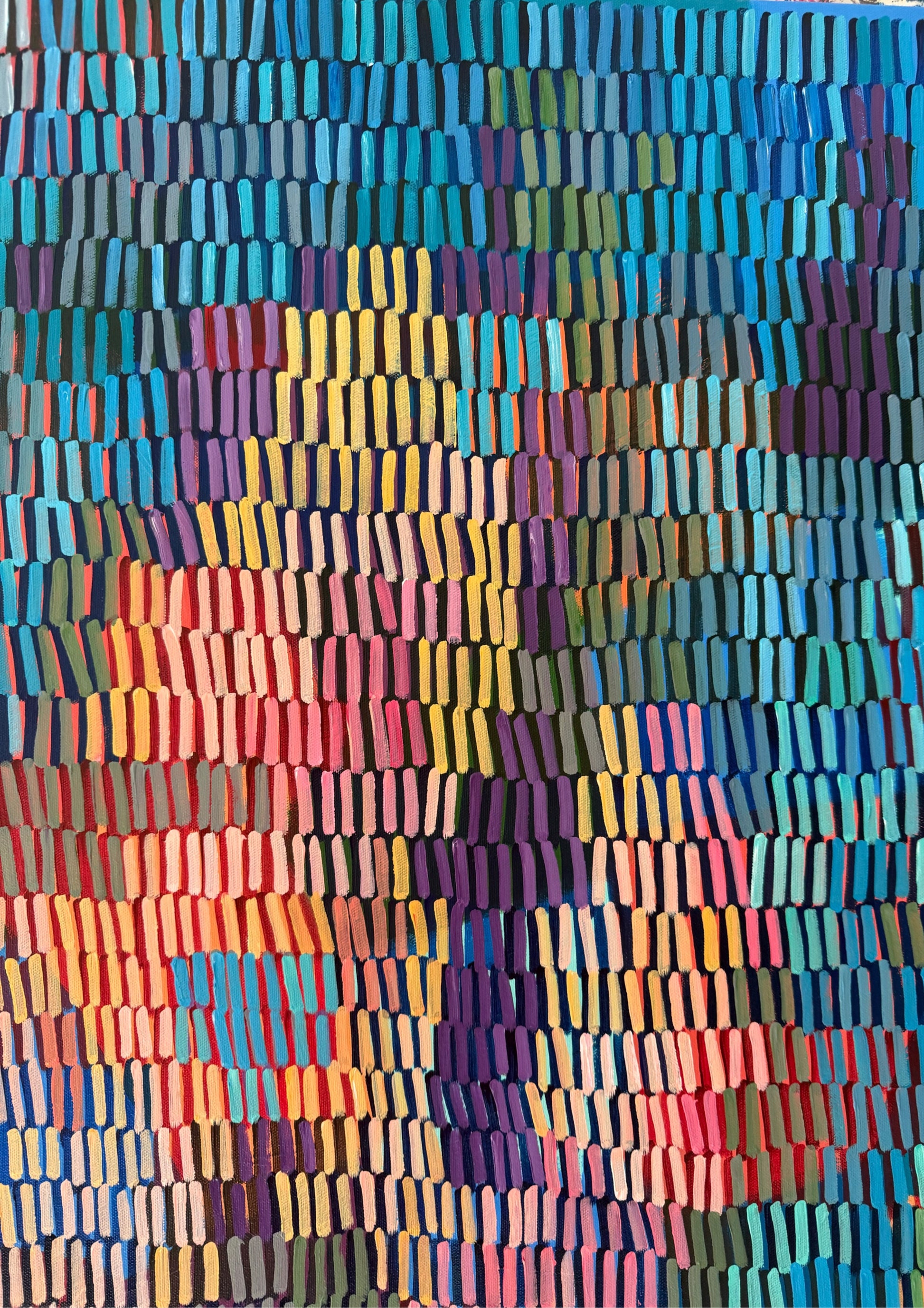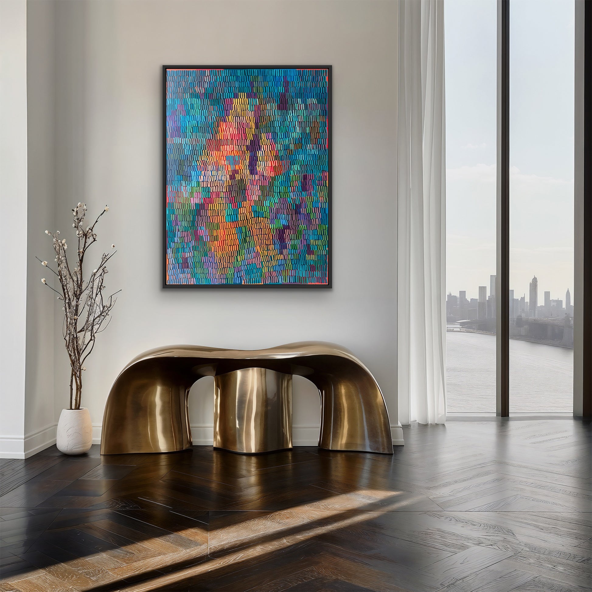 This abstract painting is a vibrant tapestry of spontaneity, each layer and gestural stroke telling a story of intuition and emotion. Crafted from memories and impressions, it captures the essence of life in its raw form. The repetition of mark-making serves a both meditation and a conduit for artistic fulfilment, infusing the art with a profound sense of depth and meaning.