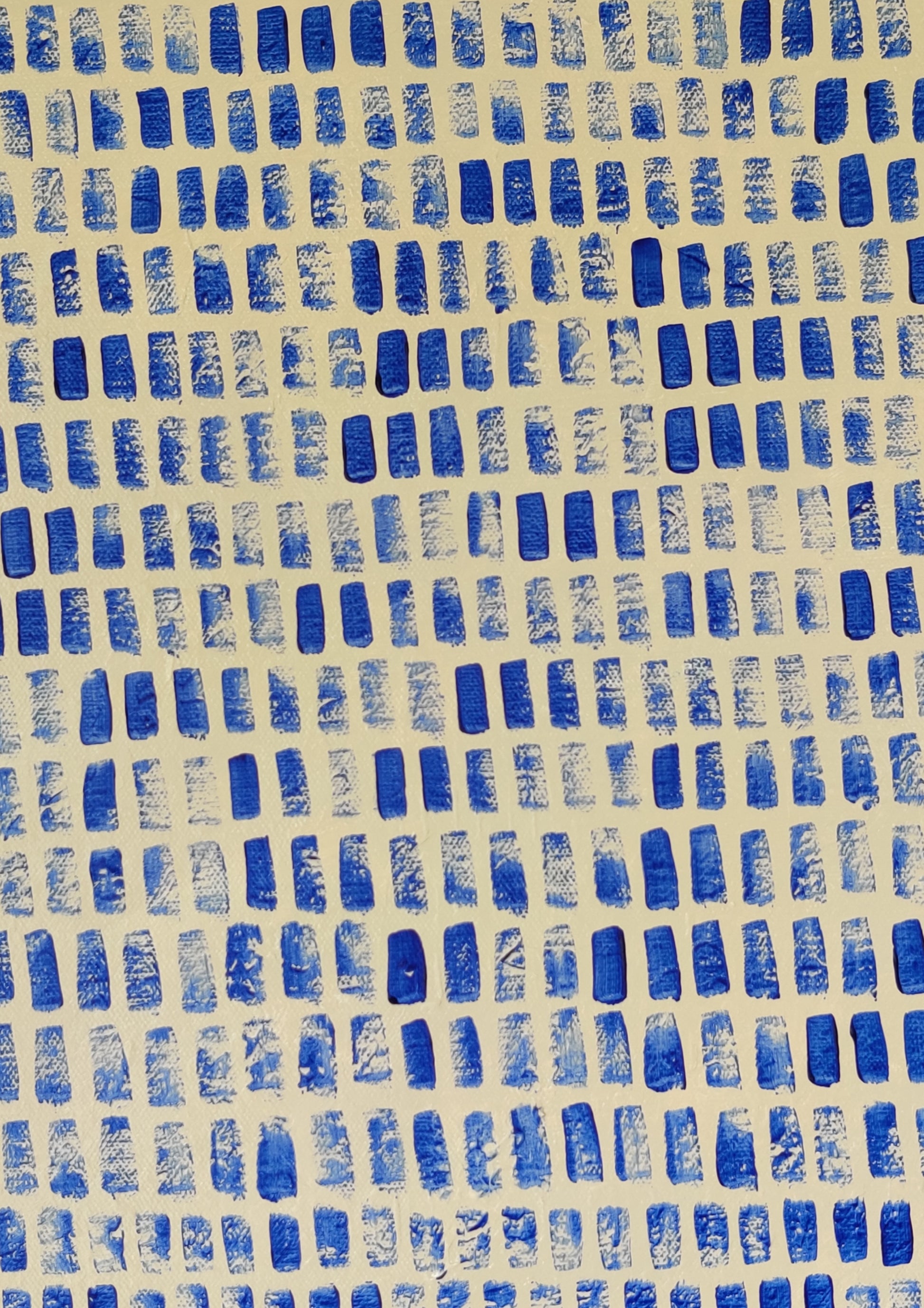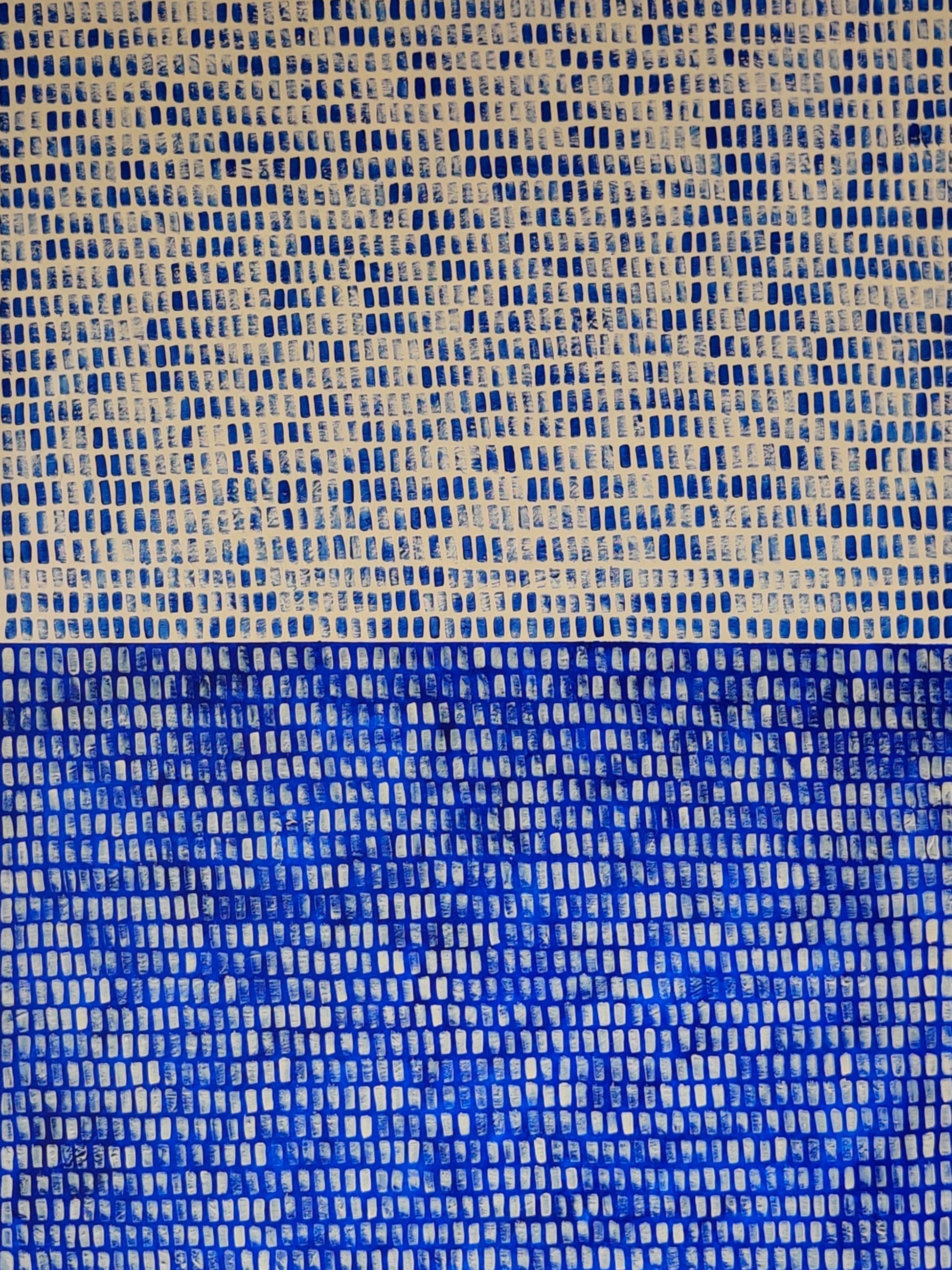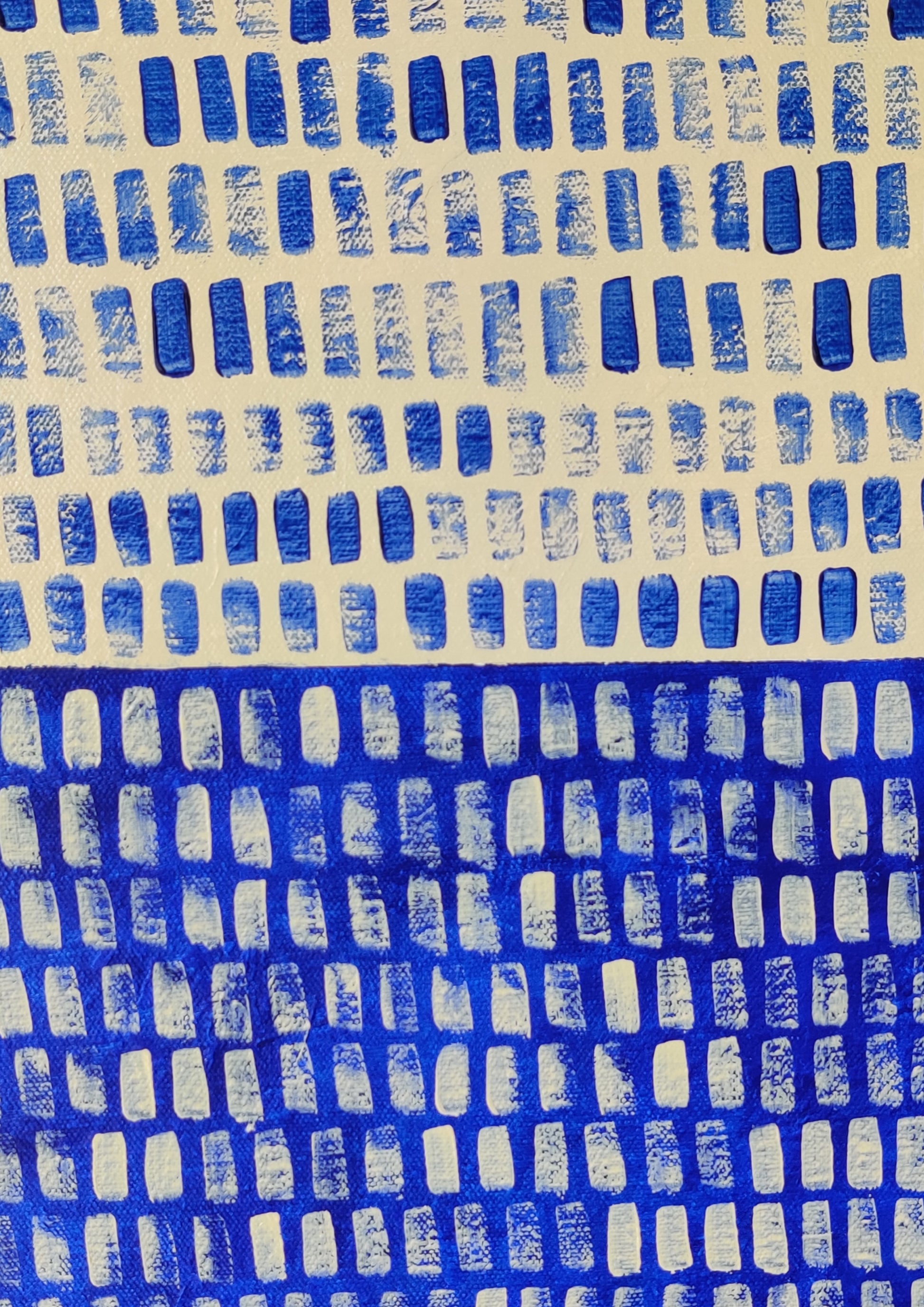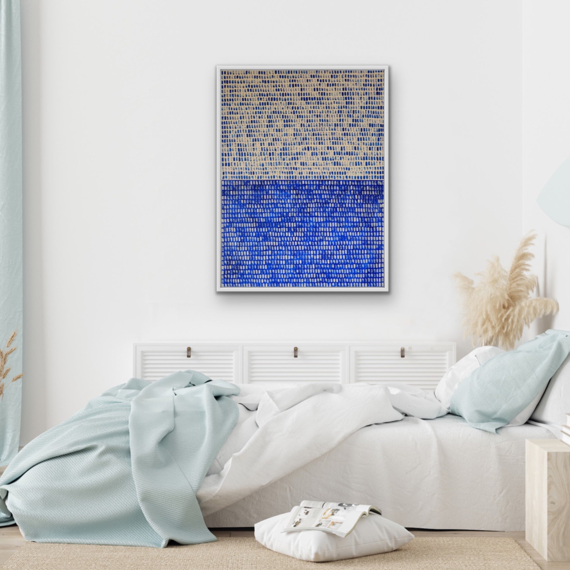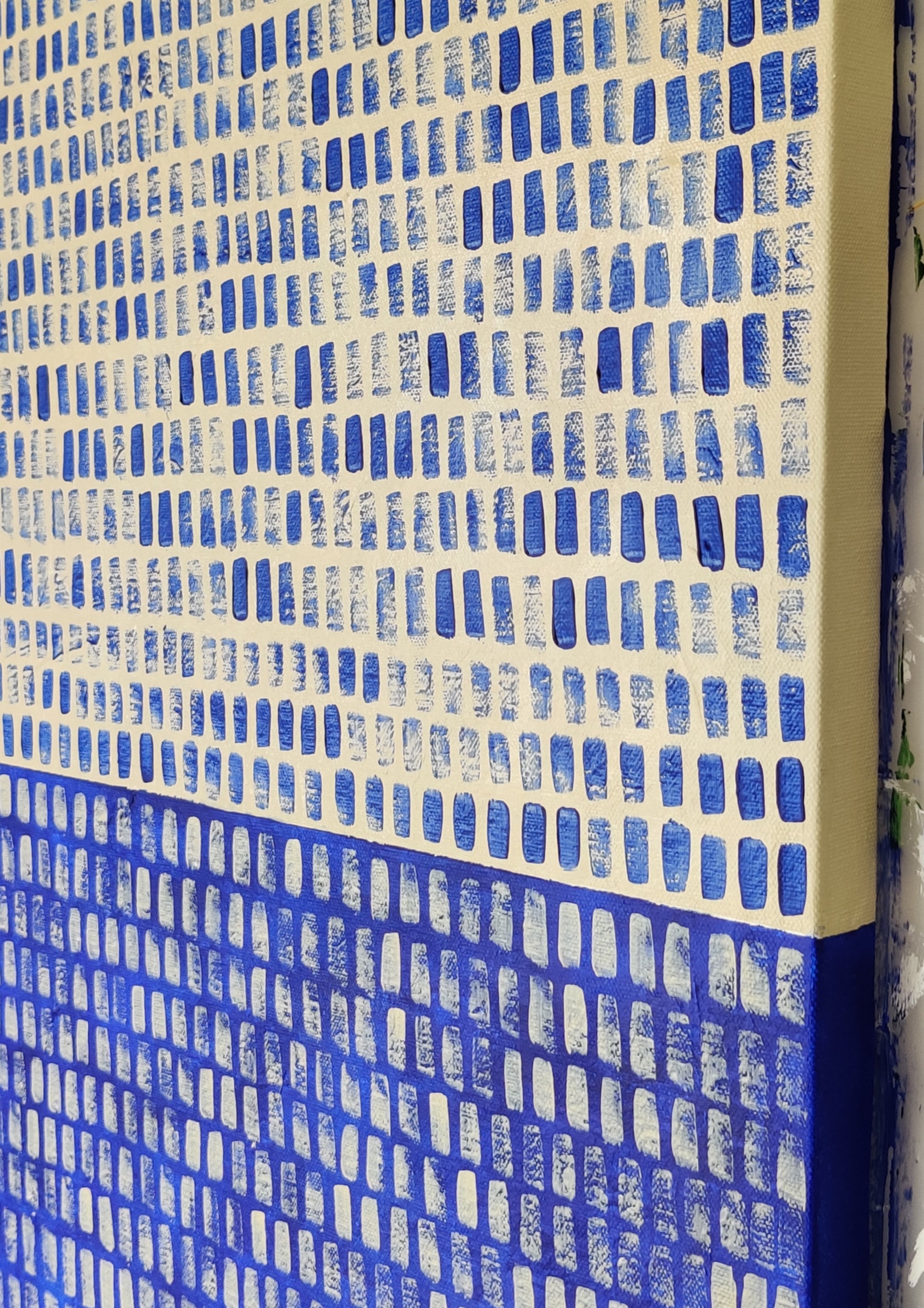 "Breathe" artwork is crafted spontaneously with layers of acrylic paint and gestural strokes. This intuitive artwork is an artistic voyage through memories, impressions of nature and practice of meditational process. The repetitive and contemplative mark-making, reflects an overwhelming sense of artistic fulfilment.