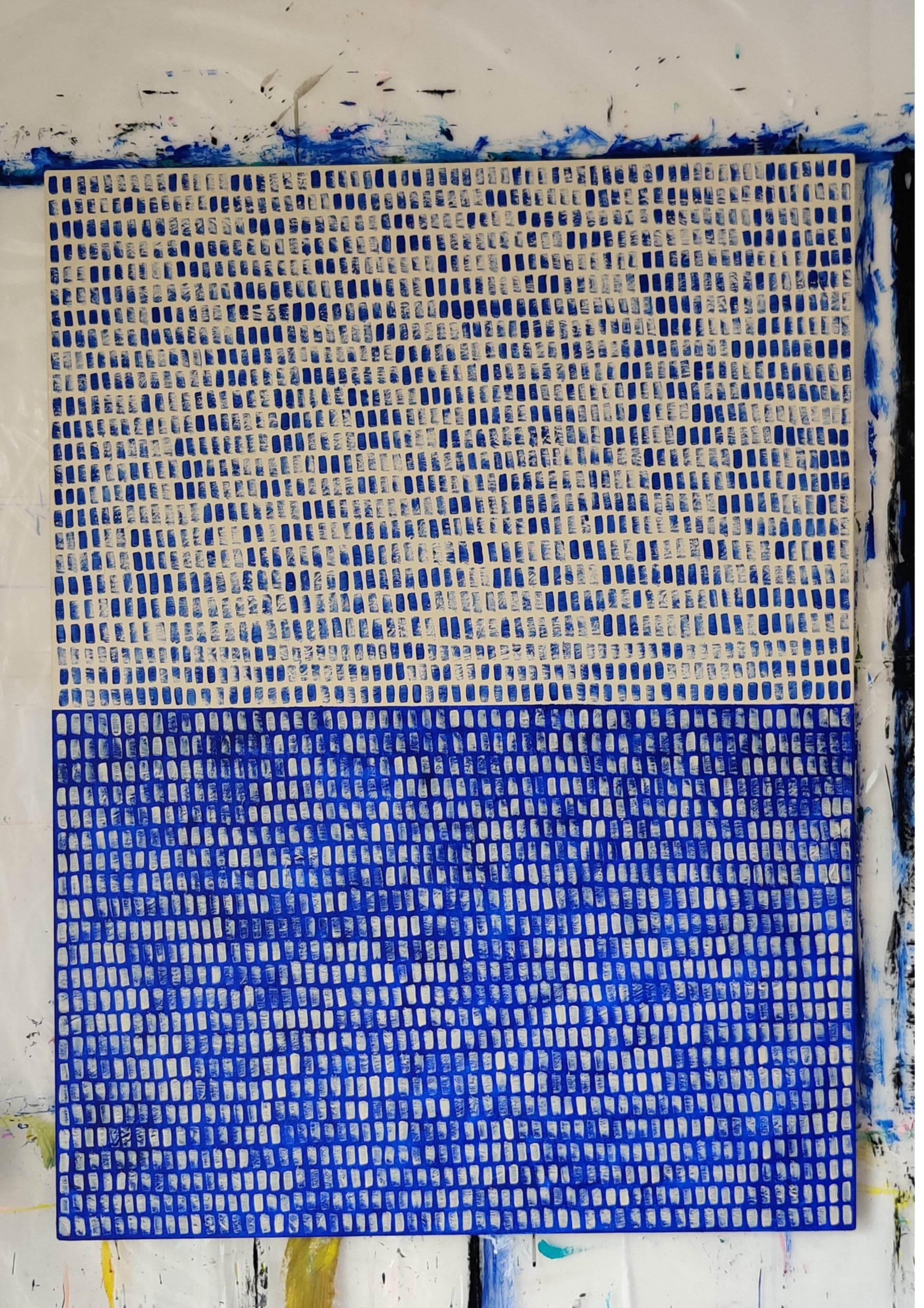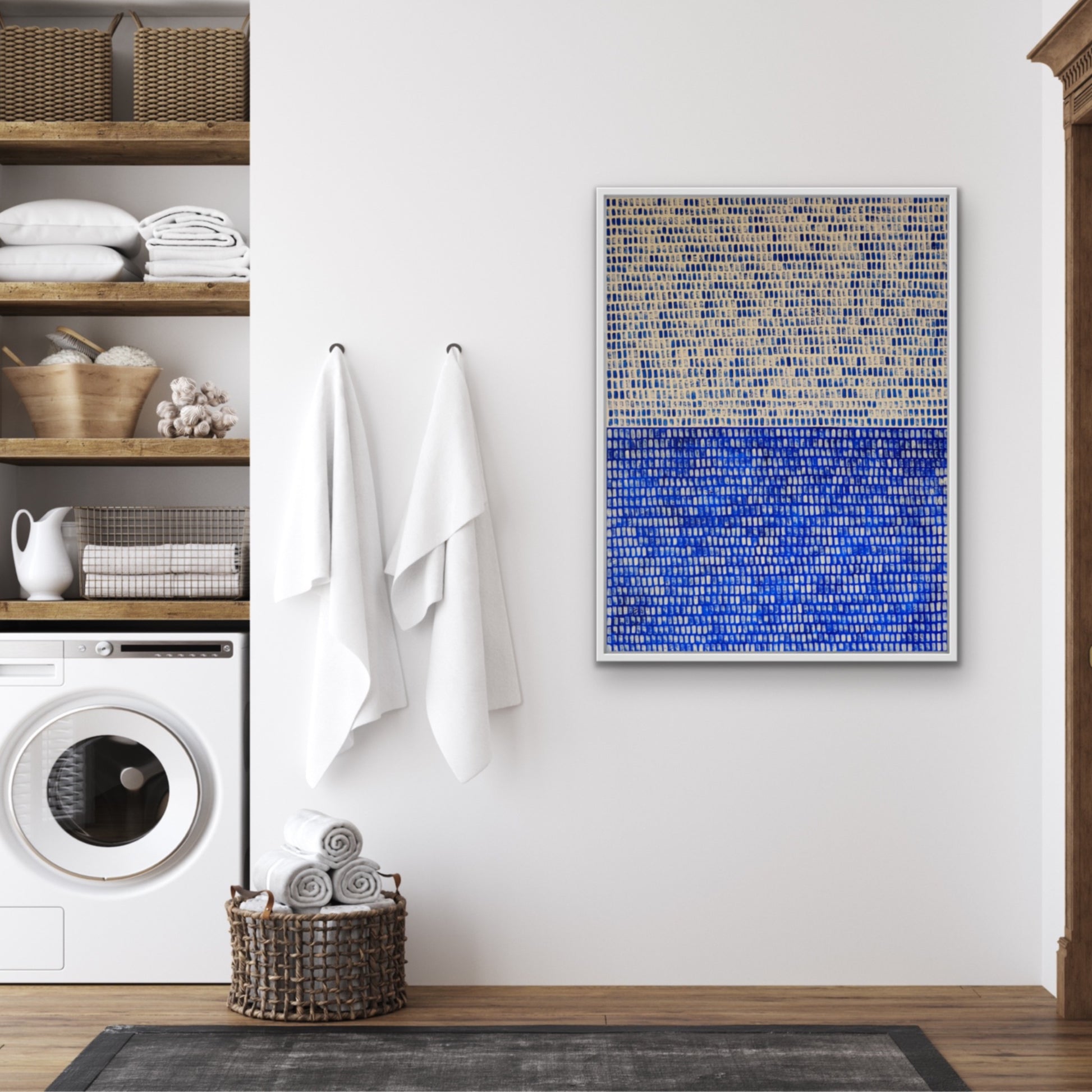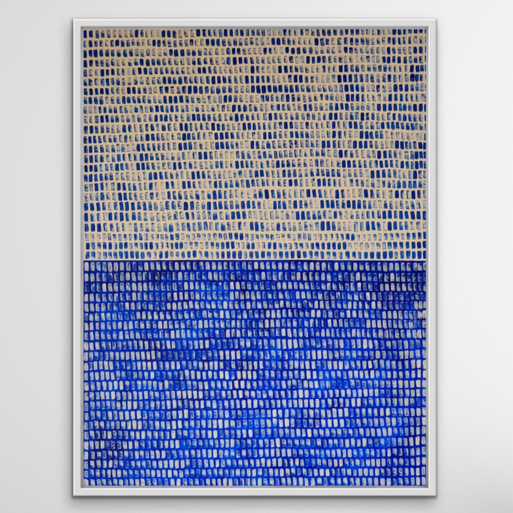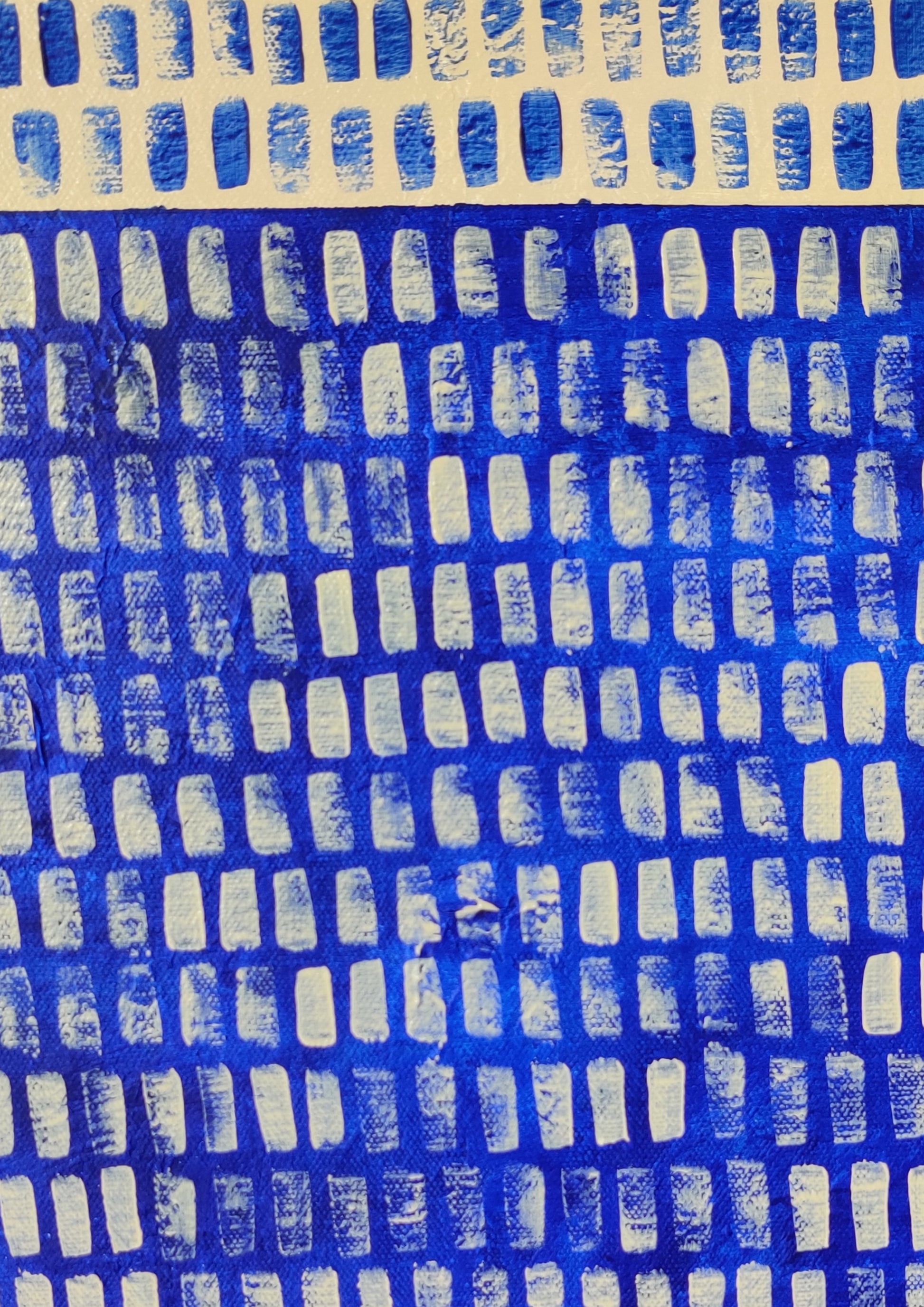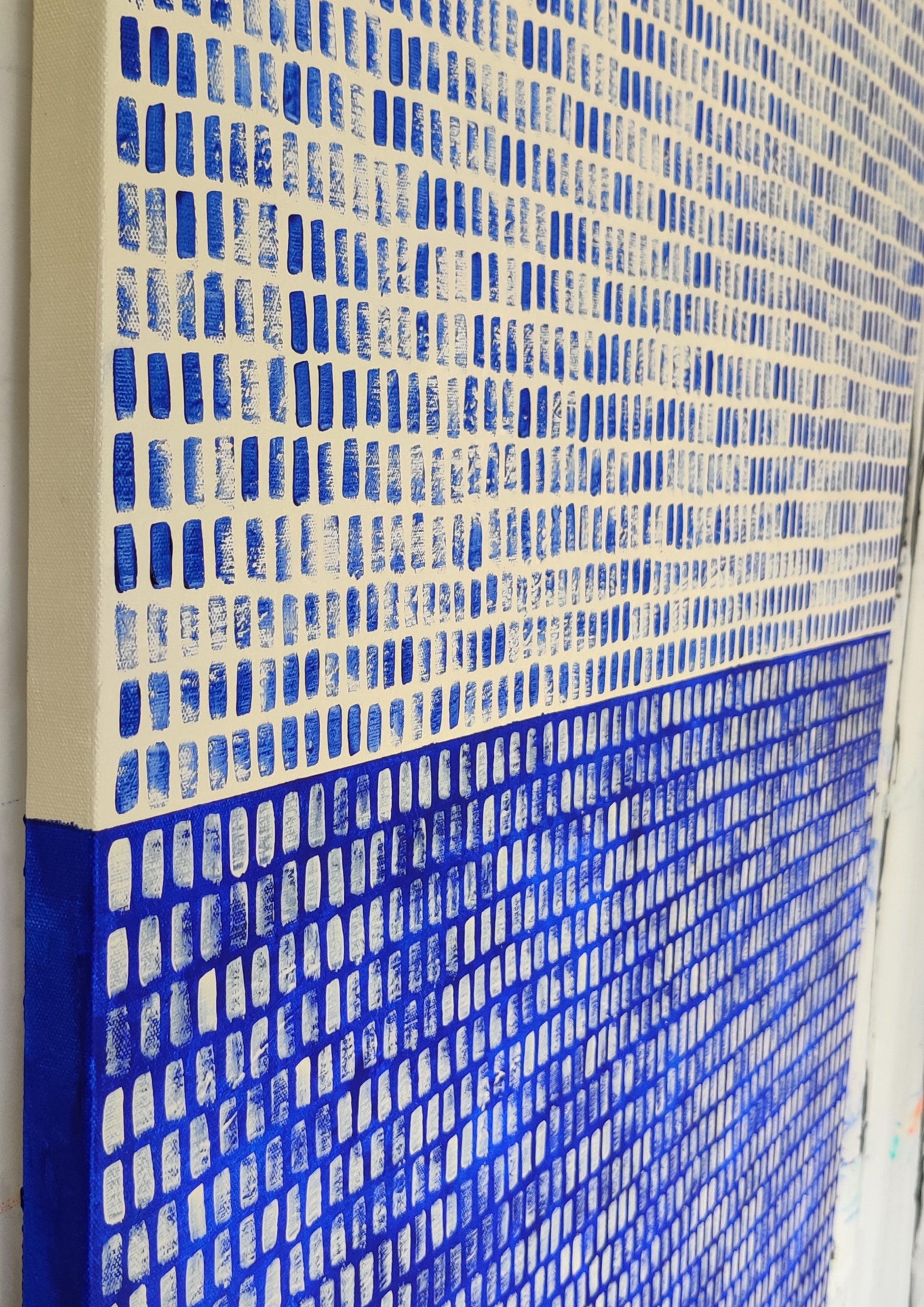 "Breathe" artwork is crafted spontaneously with layers of acrylic paint and gestural strokes. This intuitive artwork is an artistic voyage through memories, impressions of nature and practice of meditational process. The repetitive and contemplative mark-making, reflects an overwhelming sense of artistic fulfilment.